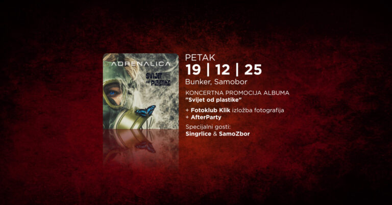U petak, 19. prosinca 2025., s početkom u 20:00 sati, nastupit ćemo u Samoboru, u Bunkeru, na koncertnoj promociji albuma „Svijet od plastike“, koji je izdala samoborska rock grupa Adrenalica.